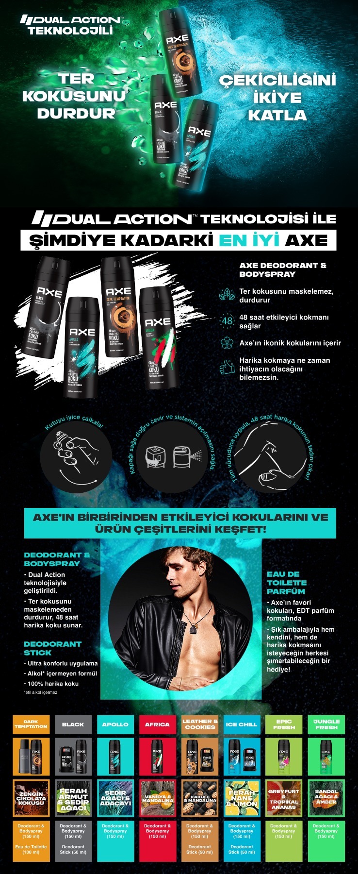 Axe etkisi ile çekiciliğini ikiye katlamak ister misin? Karşı konulmaz kokusuyla ter kokusuna karşı mücadelende yanında olan yeni Axe Apollo EKSTRA BÜYÜK AVANTAJLI BOY Deodorant & Bodyspray ter kokusunu maskelemez, durdurur. 48 saat boyunca kalıcılığını koruyan harika kokusuyla bu sprey deodorant, gün boyu ferah hissetmeni sağlar. Axe’ın etkileyici kokusu üzerindeyken karşı konulmaz hissetmen kaçınılmaz! Üstelik şimdi tam sana göre 200ml boyuyla Axe Apollo EKSTRA BÜYÜK AVANTAJLI BOY ekstra büyük, ekstra çekici! Yoğun günlerinde ter kokusunun modunu aşağı çekmesine izin verme. Yeni Axe Apollo EKSTRA BÜYÜK AVANTAJLI BOY* Deodorant & Bodyspray’in 200 ml boyutu ile ter kokusundan çekinmene gerek yok! Çünkü Axe ter kokusunu maskelemez, durdurur. Ter kokusuna karşı geliştirilen teknolojisi zamandan ve mekândan bağımsız, AXE Apollo’nun güçlü etkisini daima yanında hissetmen için hazırlandı. Tanrılara layık bir formül ve tasarım. AXE Apollo bir deodorantta aradığından çok daha fazlasını sunmak için özel olarak formüle edildi. Ter kokusuna sebep olan bakterileri 48 saat durdurmasının yanı sıra, yenilenen şık tasarımıyla da tam sana göre. Tüm vücuduna uygula ve 48 saat boyunca etkileyici kokmaya devam et. Çekici ve havalı kokusuyla tüm vücudunda kullanabileceğin Axe vücut spreyi; gün boyu seni terlemenin getirdiği kötü kokulardan korur. Zinc zap içeren Dual Action teknolojisi ile Axe Apollo Deodorant & Bodyspray, 48 saat boyunca ter kokusunu durdurur. Axe deodorantın doğanın güçleri ve sofistikeliği bir araya getiren etkileyici kokusuyla cool ve fresh Axe etkisi tüm gün seninle! Gün boyu harika kokunla herkesi etkilemek ve özgüveninden ödün vermeden hareket etmek için çözüm çok basit. Yeni Axe Apollo EKSTRA BÜYÜK AVANTAJLI BOY* ile çekiciliğini ikiye katla! Erkek deodorant önerisi arayanlar için ter kokusunu maskelemeden durduran, 48 saat kalıcı yeni Axe Apollo EKSTRA BÜYÜK AVANTAJLI BOY* Deodorant & Bodyspray: ekstra büyük, ekstra çekici! Kullanım: Her kullanım öncesi çalkalayın. 15 cm uzaktan vücudunuza sıkın. İçindekiler: Butane, Alcohol Denat., Isobutane, Propane, Parfum, Zinc Neodecanoate, Isopropyl Myristate, Alpha
