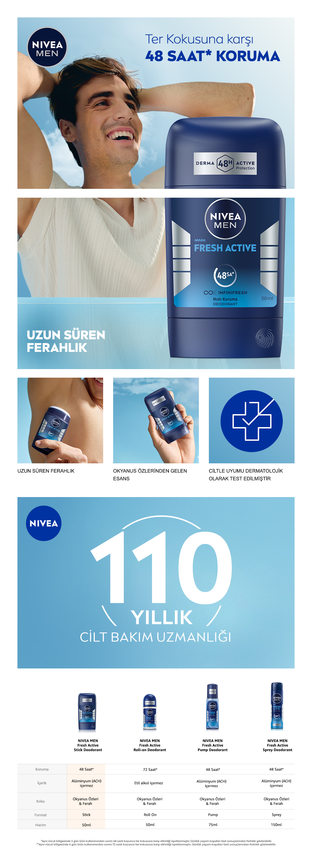 - NIVEA MEN Erkek Stick Deodorant Fresh Active 50m,Ter ve ter kokusuna karşı cildinize önem veren 48 saate kadar etkili deodorant koruması sağlar. Doğal, etkili ve egzotik bir kokusu ile tüm gün özgüvenli hareket etmenizi sağlar.